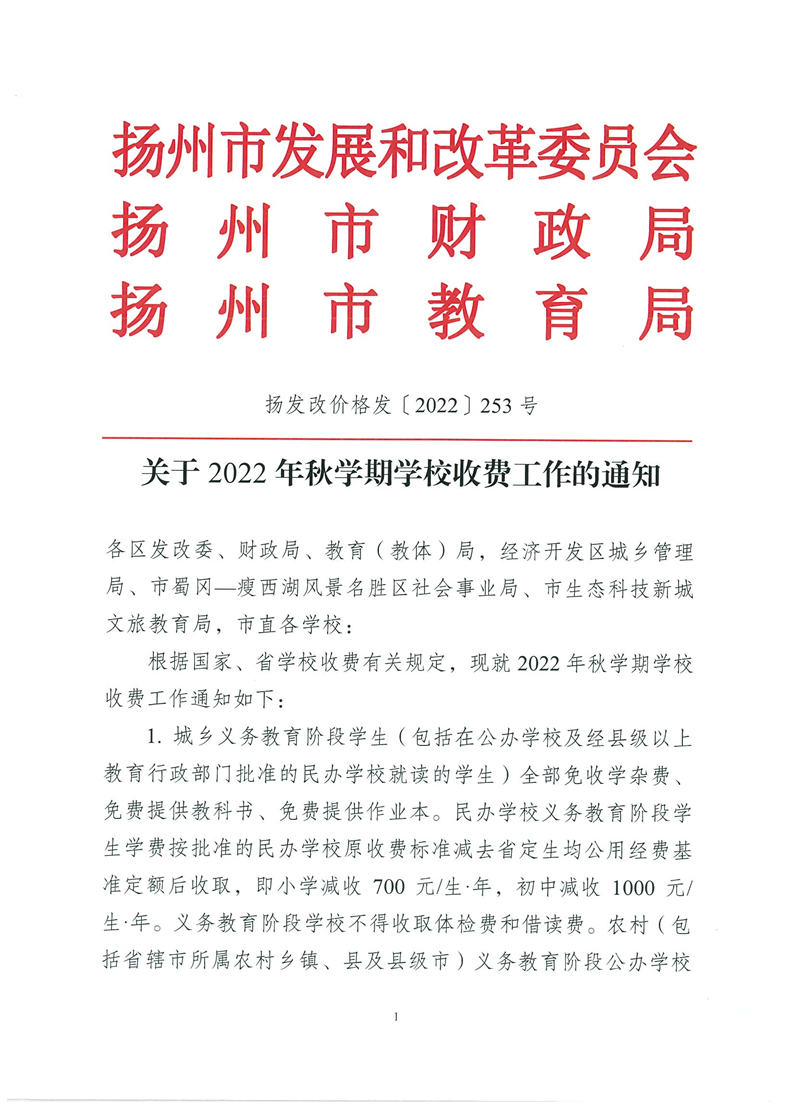 (扬发改价格发〔2022〕253号)关于2022年秋学期学校收费工作的通知