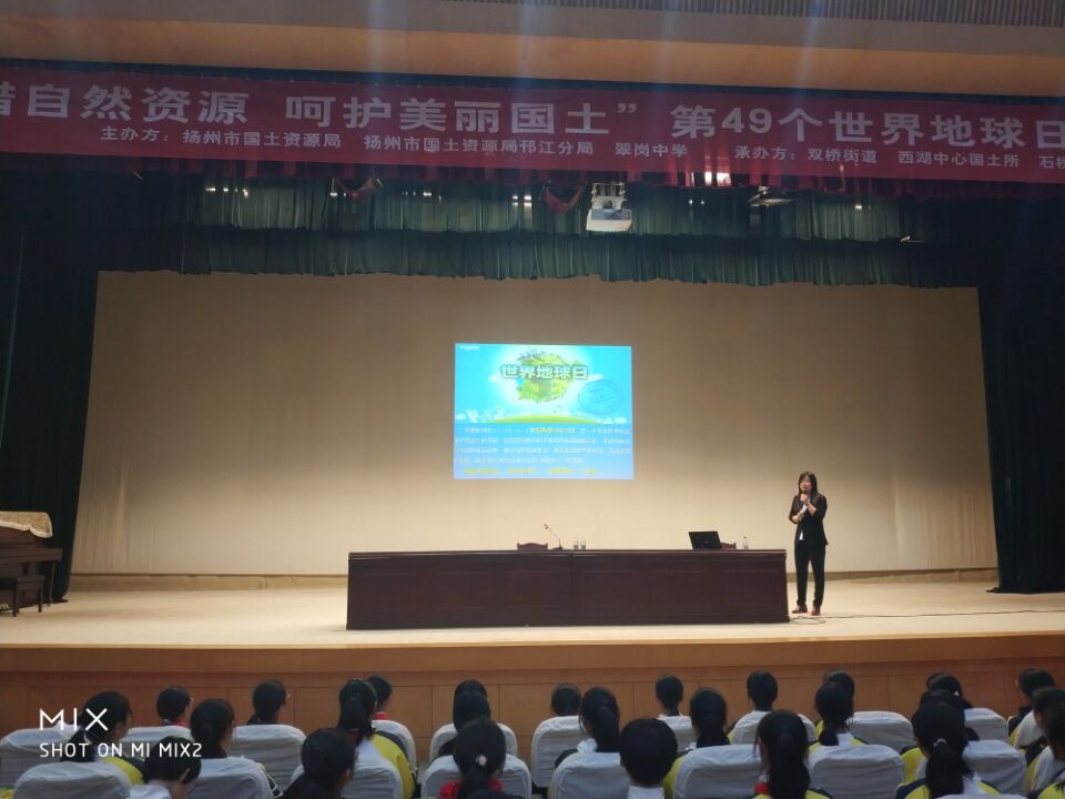 今年4月22日是第49个"世界地球日",4月19日中午,我校利用中午午间一刻的时间,与扬州市国土资源局、扬州市国土资源局邗江分局、双桥街道、西湖中心国土所、石桥社区共同举办了主题为“珍惜自然资源,呵护美丽国土”的宣传纪念活动。