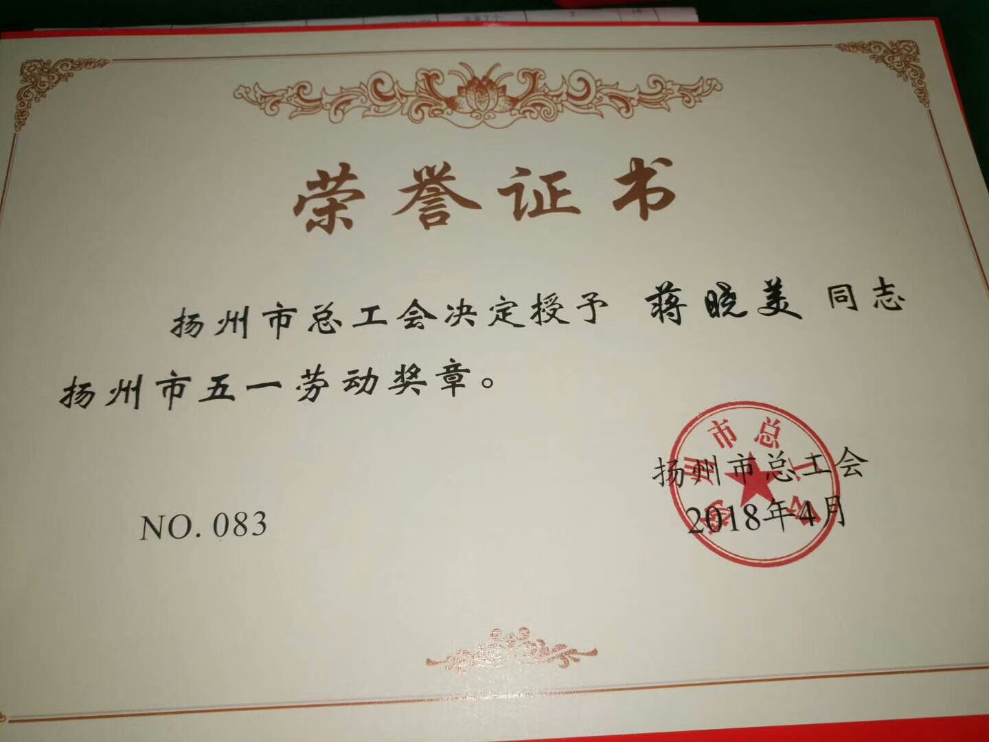 热烈祝贺我校蒋晓美副校长荣获扬州市五一劳动奖章!