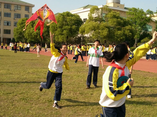 本届风筝节的主题为“齐心协力,放飞梦想”,整个活动由初一大队委全程独立策划,同学们自主设计并协力完成风筝图案的绘制,完成后在风筝上签上了自己的名字。在富有感情的《你是人间的四月天》诗朗诵后,各班班长手持风筝依次解说各班风筝的内涵,十二个个性化的风筝背后,寄托的是十二个班级、六百余名同学的梦想。主持人宣布放飞开始后,各班学生代表迅速带着本班的风筝在操场正中放了起来,他们或是拉线奔跑,或是调整角度,或是适应风向,不一会儿,颜色图案各异的风筝便高高低低地飘扬在蔚蓝的天空之下。其他同学则在一旁围观,为本班同学鼓劲,为自己的梦想飞上蓝天而欣慰。