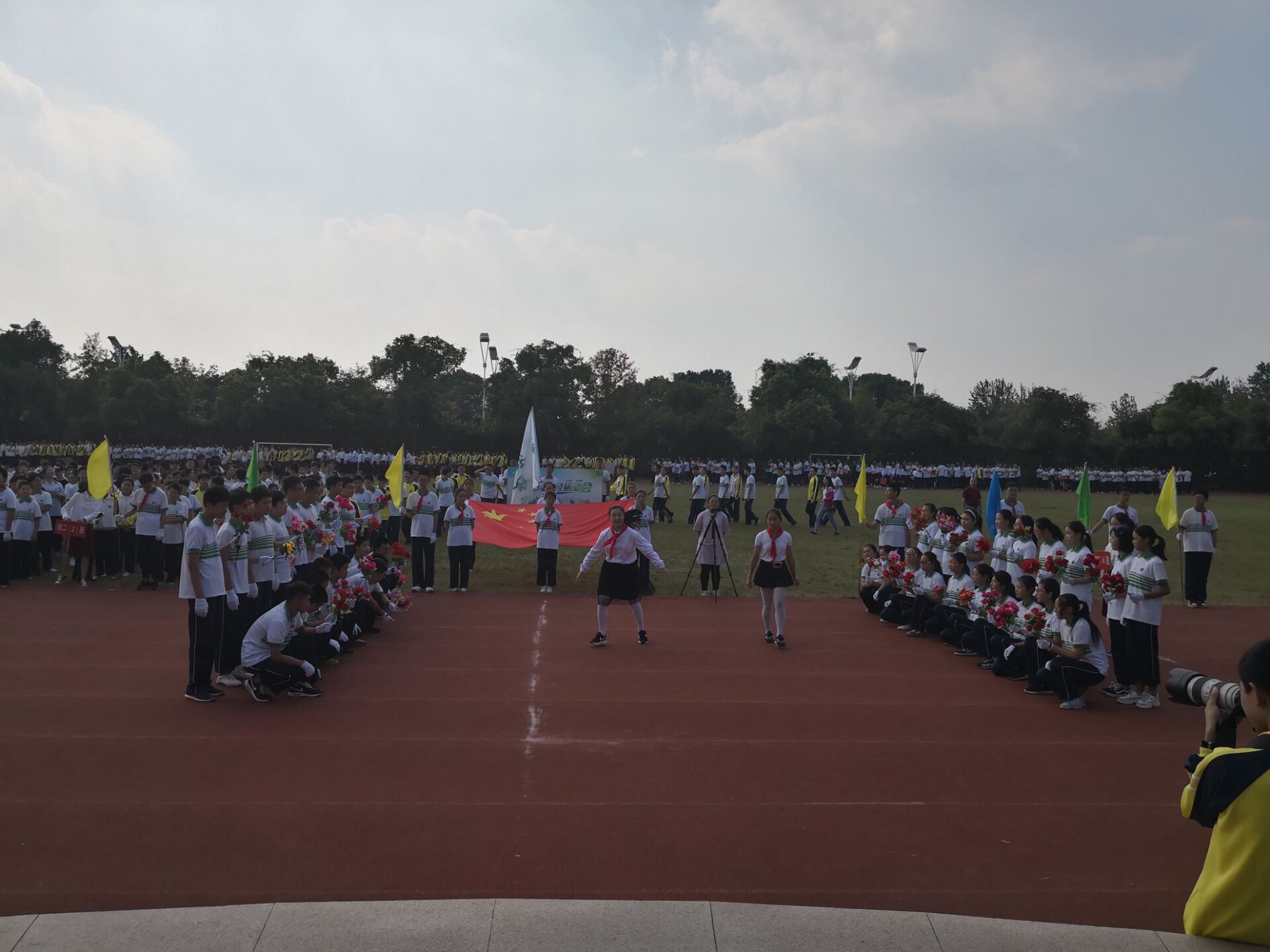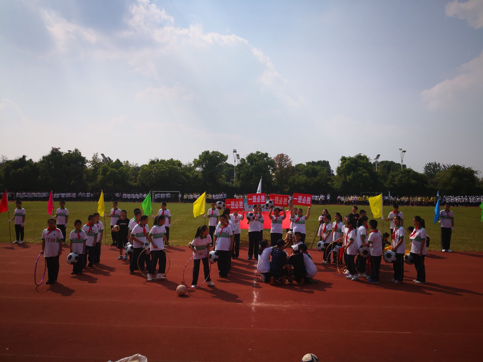 下午2点,运动会正式开幕。伴随着嘹亮激昂的运动员进行曲,国旗护卫队迈着整齐的步伐庄严地走过主席台,接受全校师生的检阅。紧随其后的是校旗以及彩旗队。紧接着各班方阵出场,依次通过主席台,接受全校师生对他们的检阅。响亮的口号,宣告着他们的昂扬斗志;跃动的步伐,挥写着少年的青春活力;个性的服饰,演绎出班级的独特风采。或变换队形、或挥舞花球、或手持折扇、或炫动舞姿……