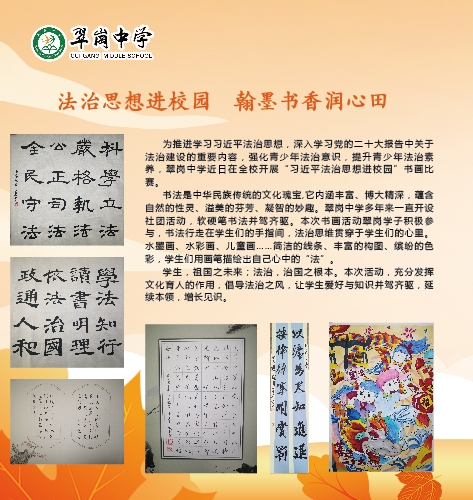 为推进学习习近平法治思想,深入学习党的二十大报告中关于法治建设的重要内容,强化青少年法治意识,提升青少年法治素养,翠岗中学近日在全校开展“习近平法治思想进校园”书画比赛。