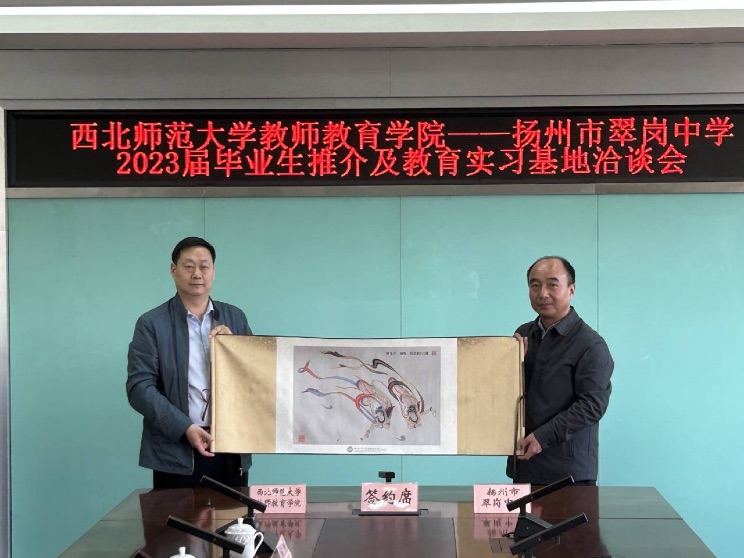 随后孙小春院长和沈在宏校长共同签署《西北师范大学教师教育学院教育实习基地协议书》,西北师范大学教师教育发展学院向翠岗中学授牌。此次签约授牌仪式的成功举行,必将开启两校互惠合作新的篇章。